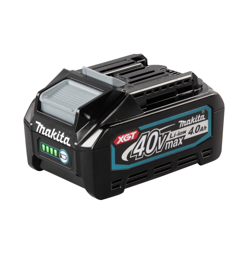 Una batería de iones de litio de 4,0 Ah con indicador de nivel de carga. Potente batería de uso general para herramientas Makita XGT® de 40Vmax. Ideal para herramientas con un alto consumo de energía. Tiempo de carga de aproximadamente 45 minutos con un cargador rápido.